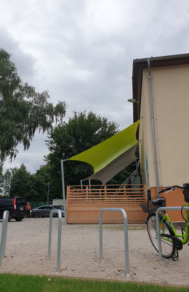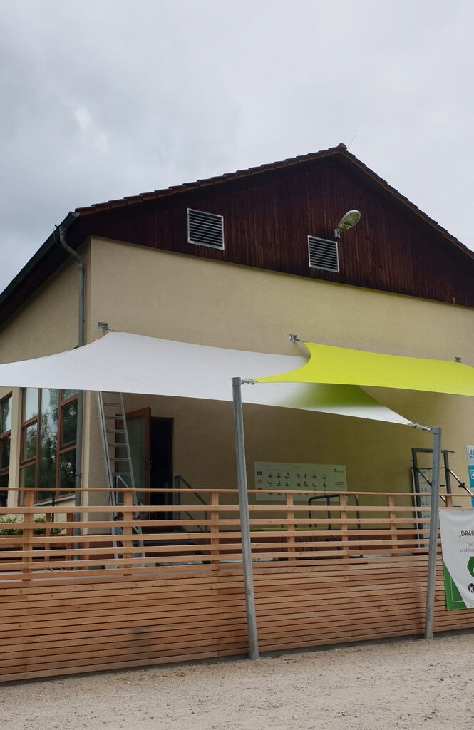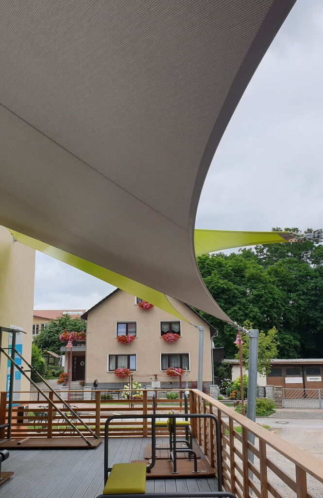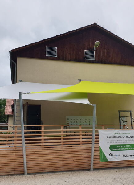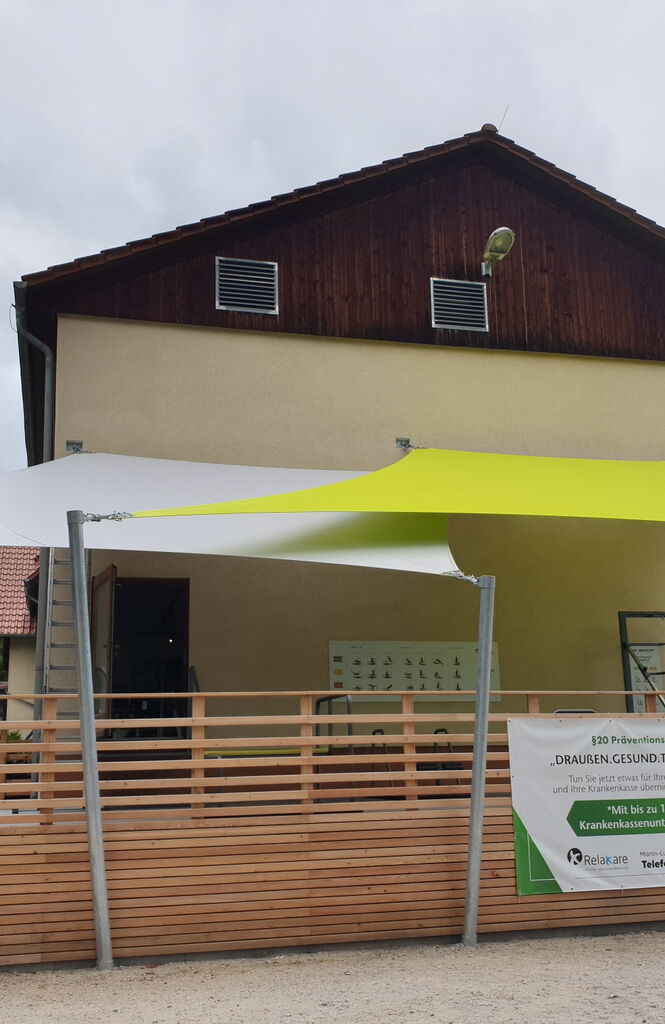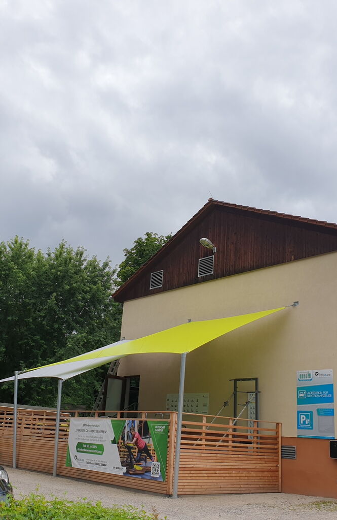 - Erhöhte Lebensqualität: Die Kunden des Fitnessstudios können somit die Außentrainingsfläche ausgiebig nutzen und erfreuen sich an der dauerhaften Beschattung über die gesamte Sommersaison von April bis Oktober. Durch die wasserdichten Segelmaterialien kann die Außentrainingsfläche auch bei Regen genutzt werden. Die Geräte und die Kunden sind bestens vor Witterungseinflüssen geschützt.